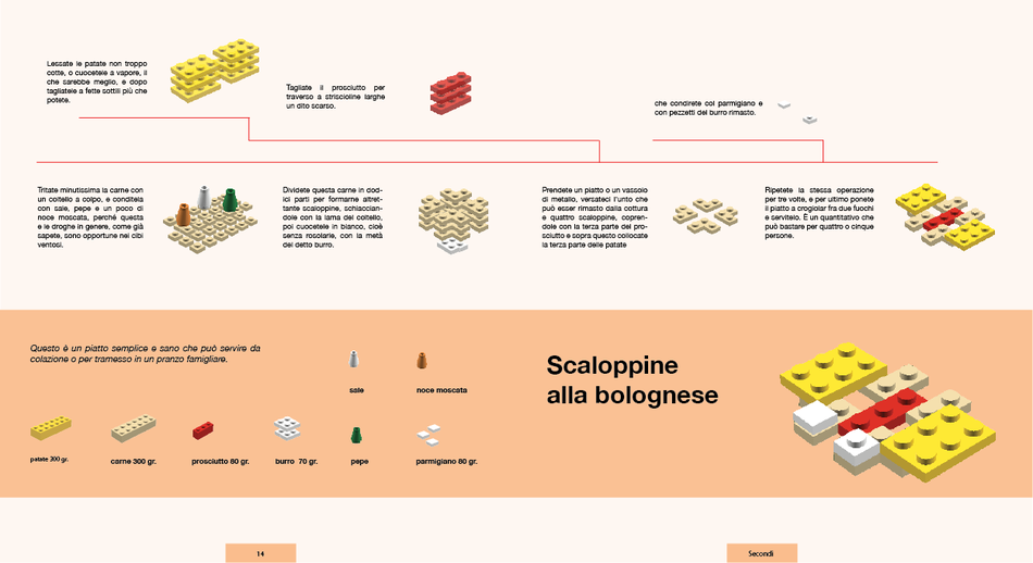 This booklet is based on “La scienza in cucina e l’arte di cucinar bene” Artusi’s book recipes, dated 1891. The challenge was to create a way to present the recipes where text and images could be read and watched together. Attached few spreads.
